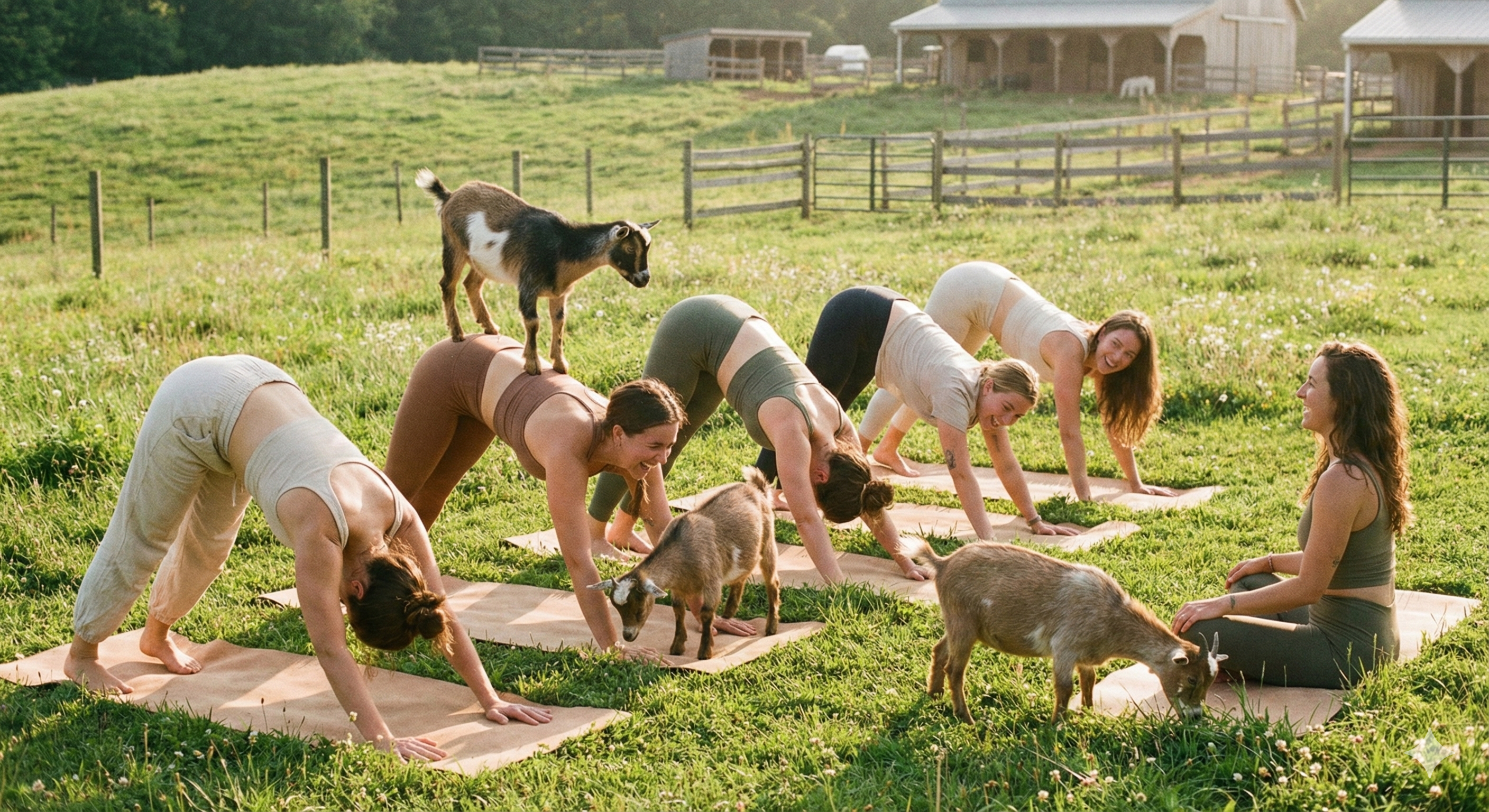 A joyful 45âminute yoga or pilates class with our juvenile pygmy goats in attendance. No experience neededâexpect gentle stretches, smiles, and lots of photos.